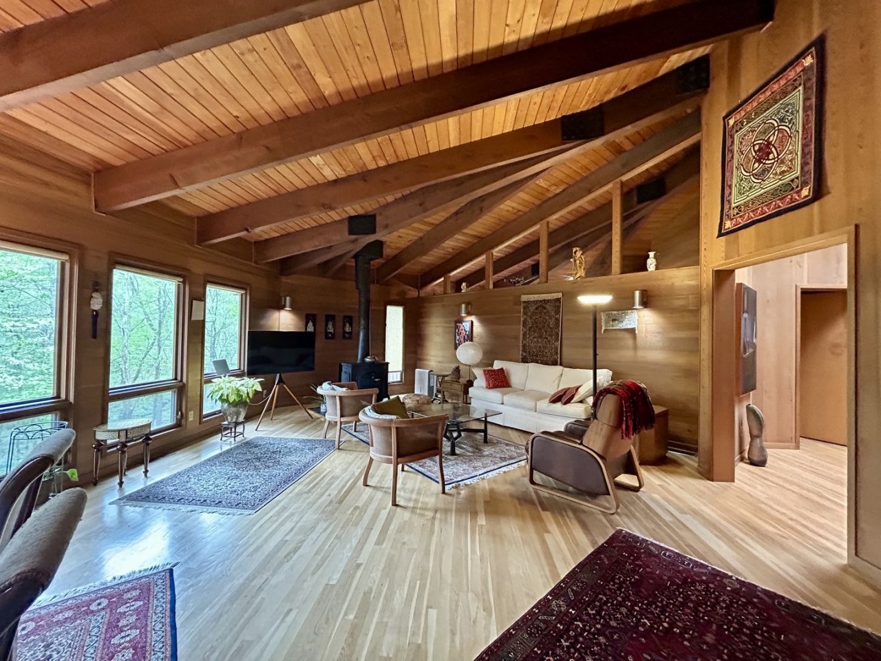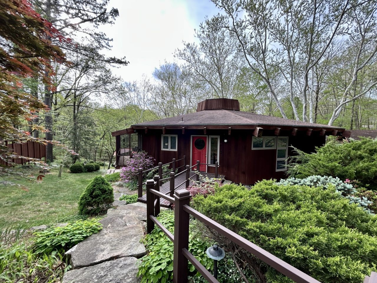 This home was custom designed and built with true craftsmanship! The exterior is Redwood and the interior is White Cedar. It's octagonal shape offers interesting geometric design elements. The Living Room and Dining Room are combined forming a wide-open space to entertain. A dedicated closet stores your entertaining wares. This room has glowing hardwood floors, soaring vaulted ceilings and a wall of windows with a view of the woodland gardens. There is also a woodburning stove for those chillier days. The Kitchen has an island, new solid surface counters, a walk-in pantry and a planning desk. The breakfast area has access to the raised screened porch. Downstairs there is a generous Family Room with more full-length windows and access to the deck. This room has pebble exposed aggregate flooring. The Primary Bedroom has clerestory windows, a Dressing Room with four closets and a built-in ironing board. There is also a private balcony. The other two Bedrooms also have en-suite baths. There is a main floor Office that could be used as a fourth bedroom or nursery if needed. There is also a convenient main floor laundry. The roofing is unique. It is covered with a special material- Cool-Vent decking. Two layers of decking, rigid insulation with airspace in-between. There is a hybrid 80-gallon heat pump hot water heater. The home sits on a quiet dead end street with no thru traffic. The peaceful serene setting makes you feel like you are very secluded but there are neighbors close by when you need them. Many residents enjoying walking the 1.2-mile loop around the subdivision. You have access to the three subdivision lakes and Cedar Lake is nearby offering fishing, boating and hiking. Protective covenants published with additional documents. S.I.U. is only 10 minutes to the north. Open air two car carport with storage. Water feature.