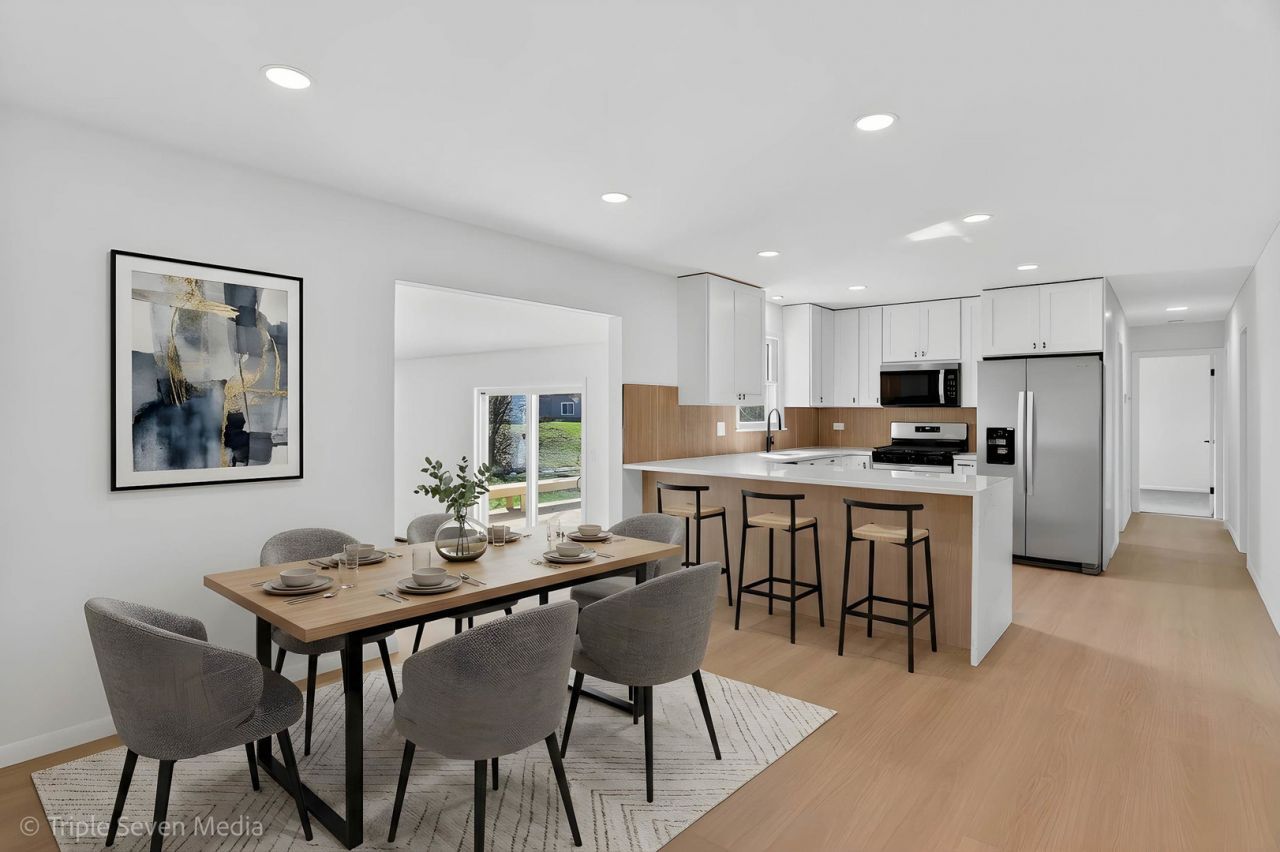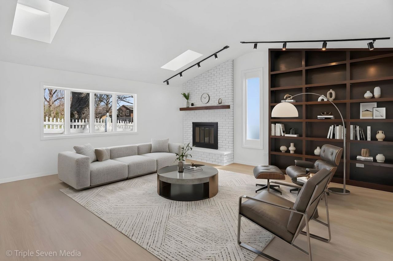 Welcome to this stunning 3-bedroom, 2-bath expansive ranch offering 1,663 square feet of expertly designed living space. The home features a newly repainted exterior and attached 2-car garage, setting the tone for the high end finishes throughout. Inside, a spacious living room flows into a striking kitchen featuring an 8-foot waterfall island in Heart of Gold quartz, soft-close cabinetry, bamboo fluted tile backsplash, and a brand-new Whirlpool appliance package including refrigerator, dishwasher, range, and microwave, accented by matte black knurled hardware throughout. The great room showcases soaring 10-foot ceilings, skylights, a matte black fireplace, and a custom-built bookshelf, with sliding glass doors leading to a large deck with built-in seating, ideal for entertaining. The home includes three generously sized bedrooms, including a primary suite with private full ensuite bath. Bathrooms feature large-format tile from floor to ceiling, creating a dramatic, marble spa-inspired feel. The basement offers clean painted ceilings and walls, ideal for a game room, gym, storage, or furnished living area, along with a dedicated laundry area. New can lighting and updated electrical, a brand-new water heater, and HVAC and roof certified by licensed professionals provide added peace of mind. Located on a quiet street near Lake George, within the subdivision of Neil Armstrong Elementary School, with nearby shopping and easy highway access.