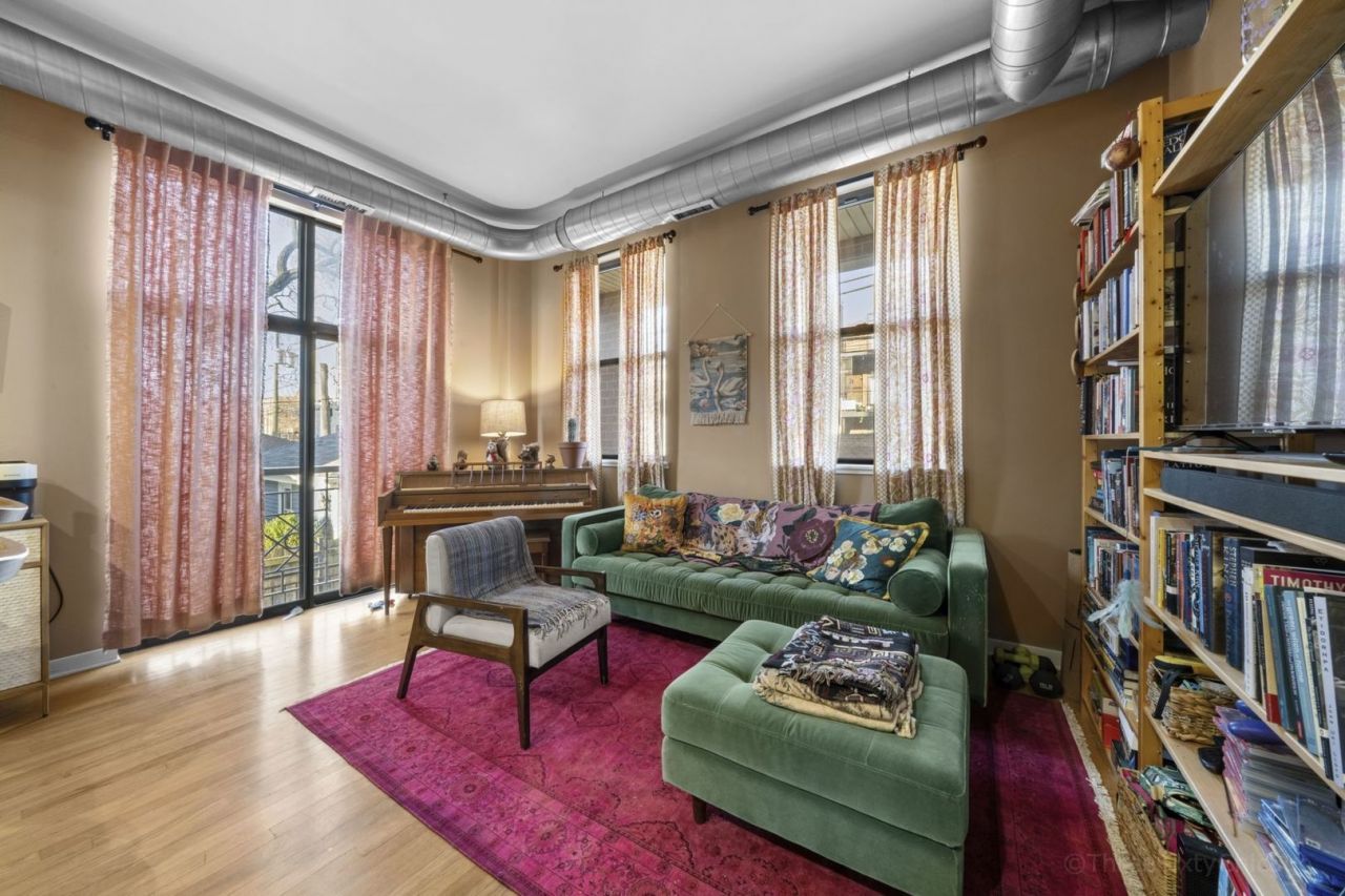 Spacious and stylish 1-bedroom corner-unit in a boutique, newer-construction elevator building in Irving Park. This move-in-ready home features hardwood floors throughout, soaring ceilings, and a welcoming entry with an oversized storage closet. The bright living space is complemented by a charming Juliette balcony and an open layout ideal for both relaxing and entertaining. The kitchen offers 42 cabinetry, stainless steel appliances, and a large breakfast bar/island. The generously sized bedroom includes a walk-through closet area leading to a dual-entry bath with a double vanity and an oversized tub/shower. Enjoy the convenience of in-unit full-size laundry, central heat and A/C, plus an exterior deeded parking space is included in the price! Low monthly HOA and a beautifully landscaped garden entrance add to the appeal. Unbeatable Irving Park location just steps to Horner Park, dog park, fitness center, summer farmers market, and the scenic riverwalk.