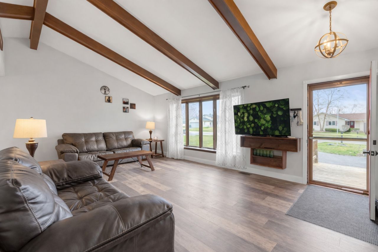 Just like that-if you've been waiting for the one, this is it. Presenting a home where timeless charm meets the perfect expression of comfortable living and an inviting, classic lifestyle. Ideally situated on a quiet cul-de-sac, the home's exterior is enhanced by a new driveway and updated garage door, elevating its overall presence. From the 2.5-car garage to the thoughtfully designed two-story layout, this residence offers a seamless balance of comfort and functionality. Upon entry, you're welcomed by modern laminate flooring that flows throughout and an open-concept design that immediately sets the tone. The living room is a standout, showcasing beautiful wooden beams, soft gray-toned floors, and an expansive window that fills the space with natural light, creating a warm and inviting atmosphere. The kitchen is equipped with stainless steel appliances and offers direct access to the fenced backyard-perfect for effortless indoor-outdoor living and entertaining. The second level features three well-appointed bedrooms, each with ample closet space, along with a shared hallway bath complete with a rainfall showerhead. One of the bedrooms serves as the primary suite, offering comfort and privacy. The lower level continues with modern finishes and begins with a full bath featuring a single vanity, followed by a well-designed laundry room with cabinetry and a dedicated folding area. The recreation space is the true highlight, complete with a custom built-in bar, beer tap capability, and a striking brick fireplace-ideal for entertaining or relaxing. Additional features include a concrete crawl space with a water softener system, providing both convenience and extra storage. The hot water heater was replaced in 2024. Showcasing pride of ownership throughout, this exceptional property is sure to capture attention quickly.